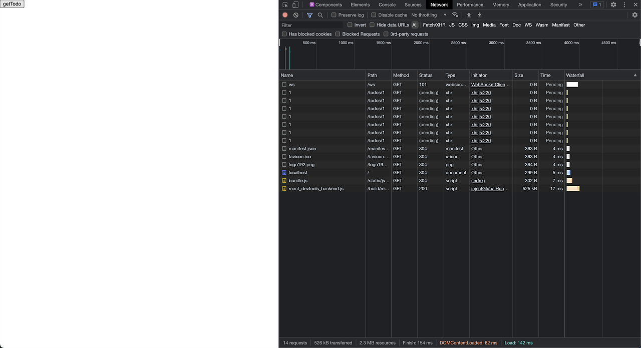 해당 코드는 https://jsonplaceholder.typicode.com/todos/1 api를 호출하여 todo 하나를 가져오는 정말로 아주아주 간단한 코드이다. 여기에 임의로 https://jsonplaceholder.typicode.com/* 에 대응되는 모든 api를 Throttler 걸어준다. (네트워크 요청을 설정해준 시간동안 모두 pending상태로 해준다.)